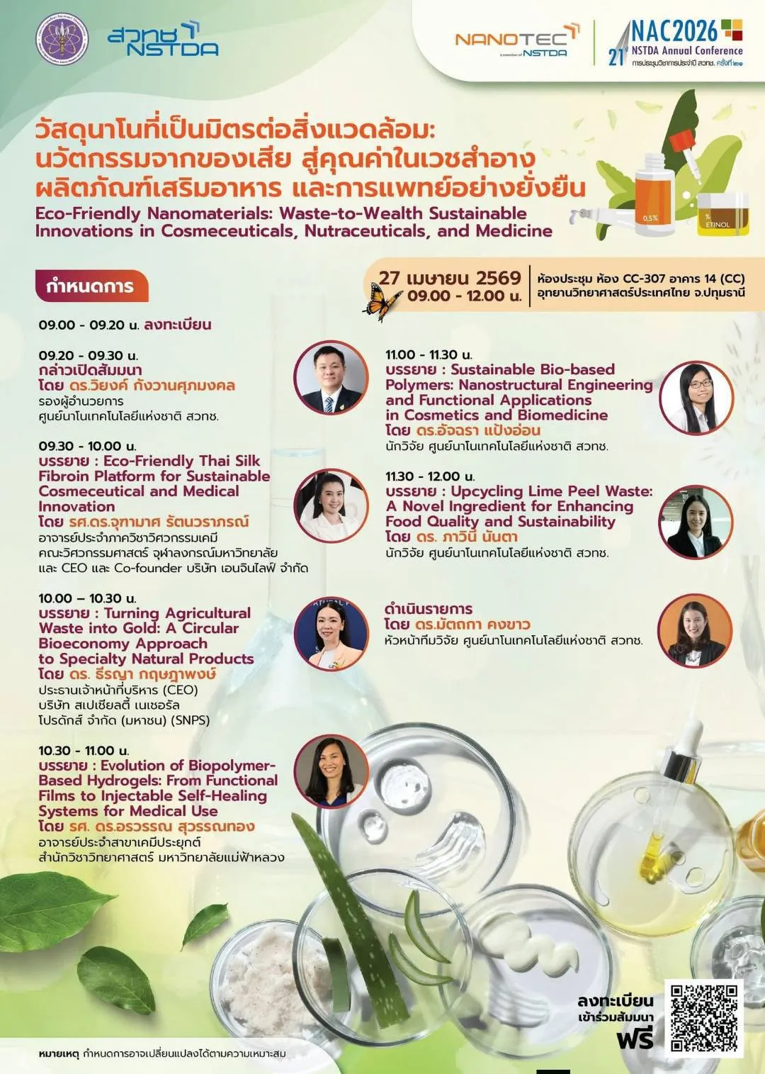 อีกหนึ่งเวทีสำคัญของ ดร.ธีรญา กฤษฎาพงษ์ CEO แห่ง SNPS ในงาน NAC2026 กับการถ่ายทอดแนวคิดการยกระดับวัสดุเหลือทิ้งจากภาคเกษตร เช่น เปลือก เมล็ด ก้าน หรือกากสกัด ให้กลายเป็นสารสำคัญคุณภาพสูง สำหรับต่อยอดสู่อุตสาหกรรมสุขภาพ ความงาม และการแพทย์